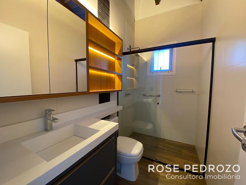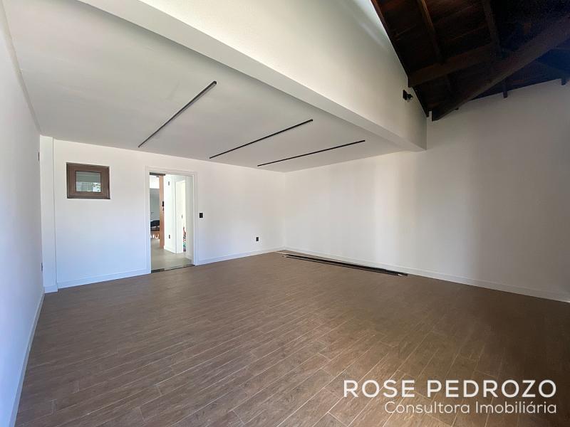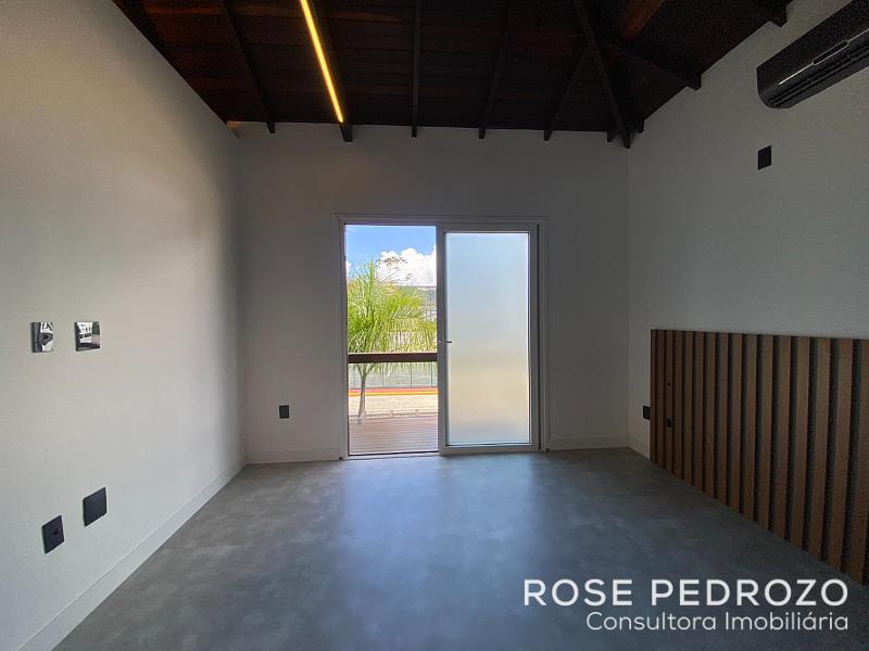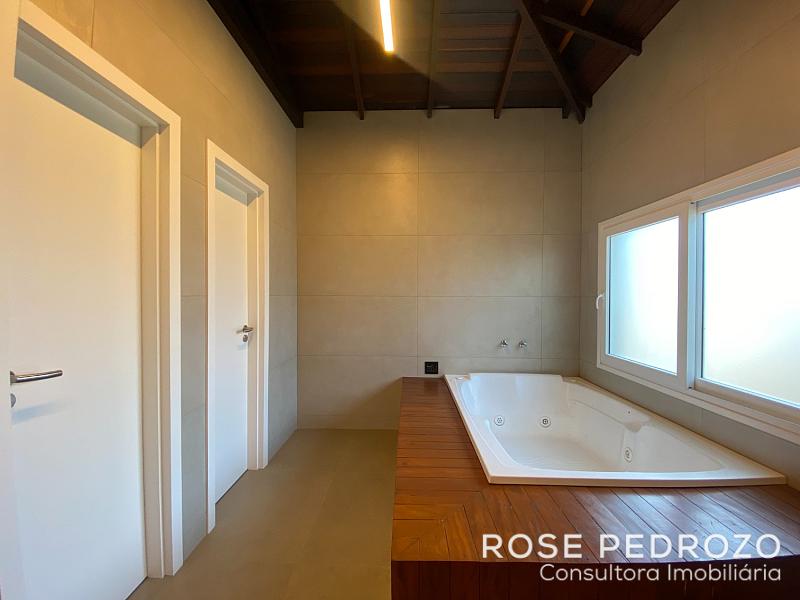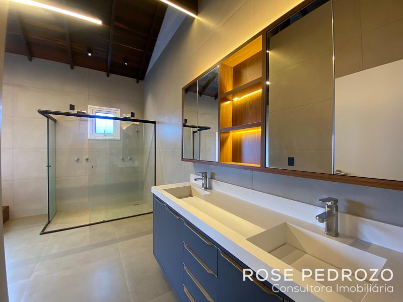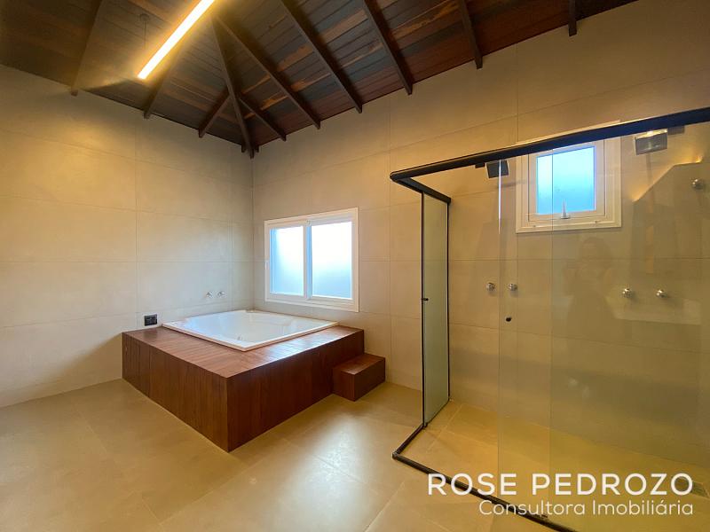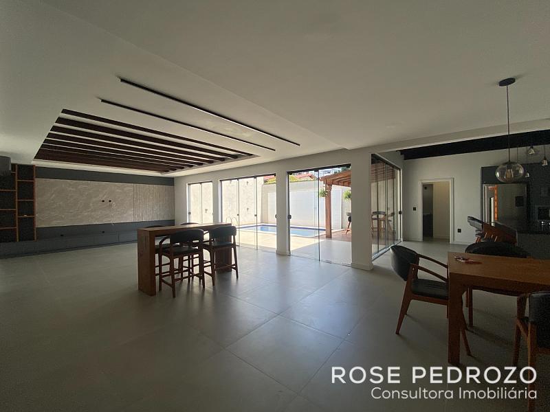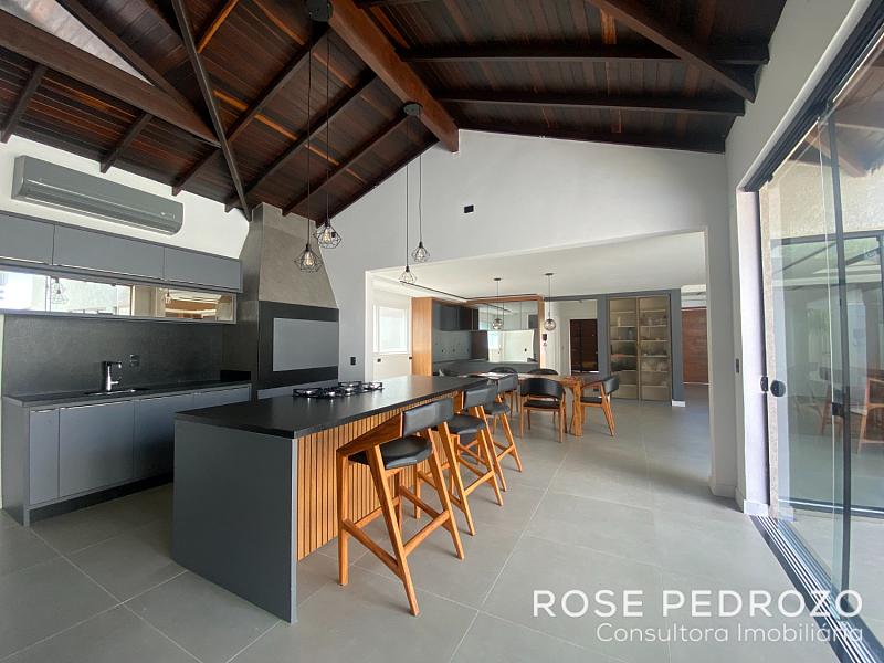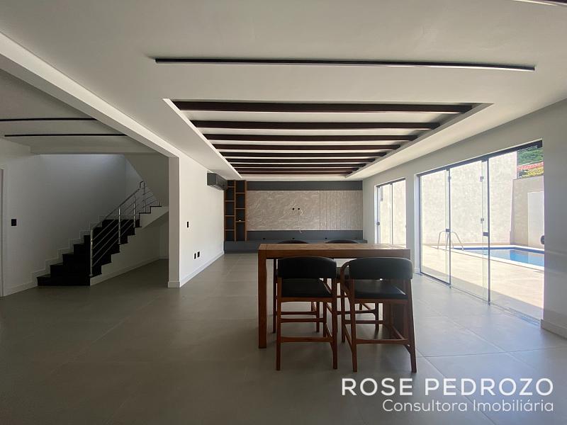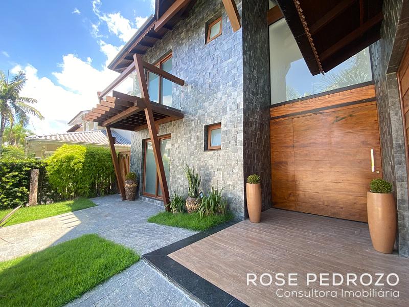 Casa no condomínio Vila Rica com 400m² privativos, 2 pavimentos, 4 suítes, sala de estar, sala de jantar e sala de TV, cozinha com churrasqueira a carvão, piscina, sauna, área de serviço e 2 vagas de garagem.
