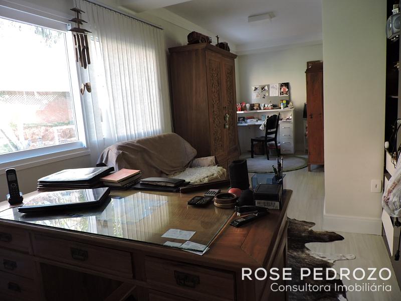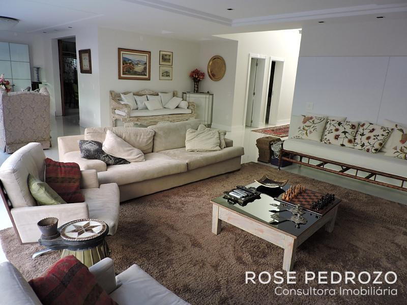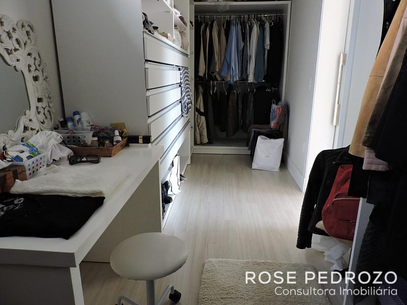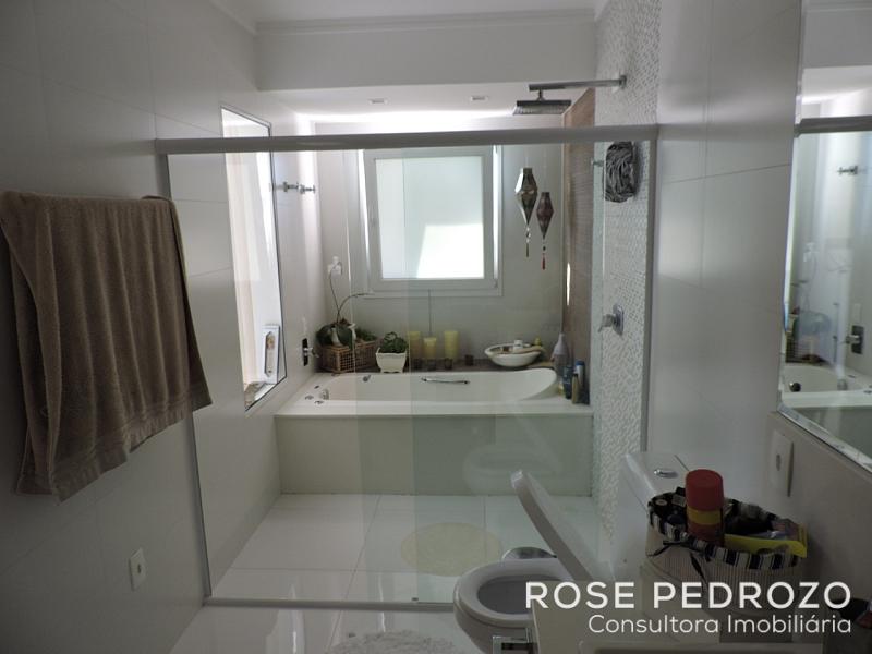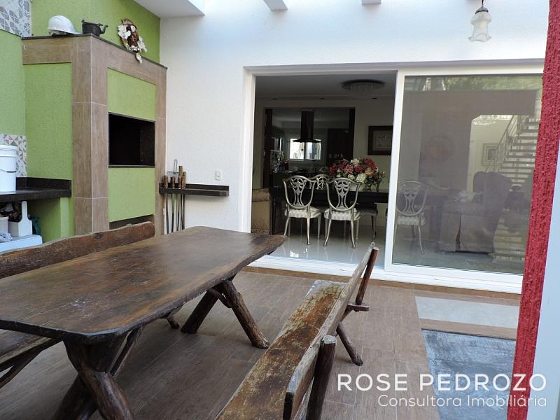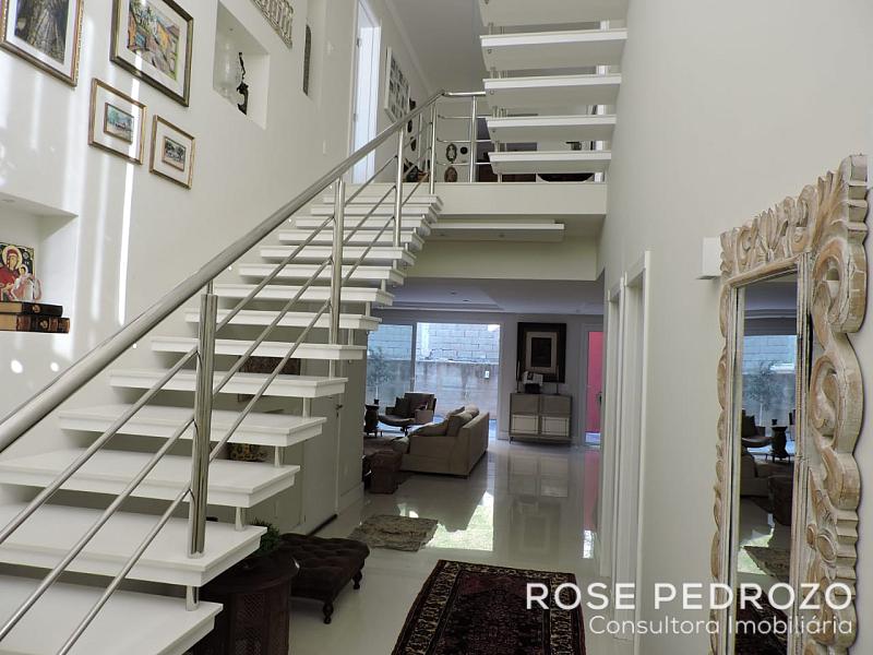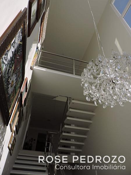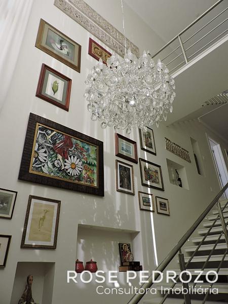 No interior, o hall de entrada possui pé-direito triplo (9m), escada interna Manske revestida com compacstone branco e corrimão em aço inox, além de altares no corredor de entrada. Conta com amplo lavabo, chapelaria/despensa, sala para 3 ambientes, espaço externo com churrasqueira a carvão e lavabo, cozinha com ilha e móveis planejados, além de área de serviço e 5 vagas de garagem.